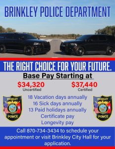 The Brinkley Police Department is hiring one (1) full-time Jailer/Dispatcher. You can pickup application up at Mayor office at 233 W Cedar Street Brinkley, AR 72021. We are a equal opportunity employer.